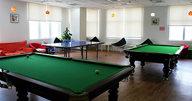 休閑中心公司在辦公區(qū)域設(shè)立了員工休閑中心,休閑中心內(nèi)有臺(tái)球桌、乒乓球桌、桌上足球等一系列玩樂(lè)設(shè)施,滿足了大家在午休和下班時(shí)間的休閑放松。