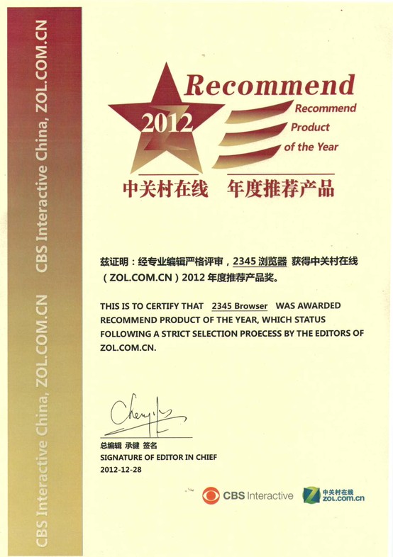 在各項軟件評選中,2345.com旗下多個產品都紛紛斬獲重量級獎項。2345看圖王和2345好壓分別獲得360年度評選裝機必備獎,而2345瀏覽器于近日獲得了中關村在線2012年度推薦產品獎。近年來,2345屢獲嘉獎,受到眾多用戶及業界的支持和認可,2345正是憑借其不斷提升的技術和用于突破的理念才獲得如此殊榮。