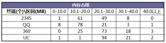 在內存占用方面,由于UC和360內存占用30M以上的機型比較多,拉高了整體數據,所以對比結果中QQ占用內存最少,2345次之,360隨后,UC最大。