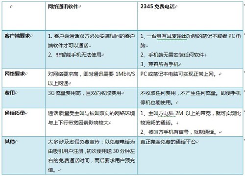 在3G和wifi未大范圍普及的情況下,使用免費通話的門檻較高,在此記者將市場上的免費通話產品做了一個對比。有網絡要求高,3G資費貴,使用不便捷的弊病,因此用2345加速瀏覽器免費打電話的優勢尤為明顯。