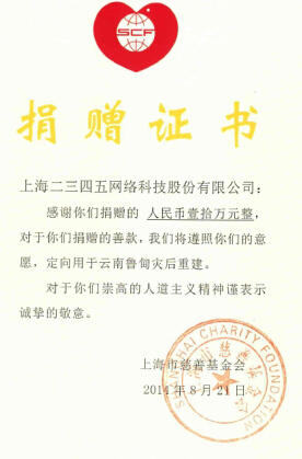 近日,上海二三四五網絡科技股份有限公司(簡稱“2345網絡”)宣布經由上海慈善基金會--2345愛心公益專項基金捐獻10萬元整用于云南魯甸地震災區的災后重建。