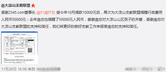 日前,公益微博賬號“@大涼山支教聯盟”發布圖文信息對2345.com董事長龐升東捐贈善款表示感謝。博文中更是提及,龐升東以連續兩年多次對該機構進行扶助。細心網友注意到,同一時期,龐升東的名字也在其他十余家支教組織的捐款公示中出現。據不完全統計,龐升東近期累計資助12家支教組織,善款總額高達83萬元。