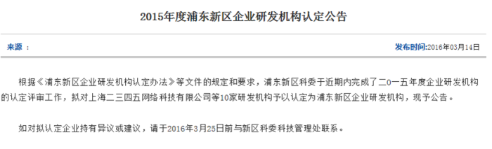 3月14日,上海市浦東新區科學技術委員會正式公示“2015年度企業研發機構”認定名單,上海二三四五網絡科技有限公司(簡稱“2345.com”)等10家研發機構榜上有名。