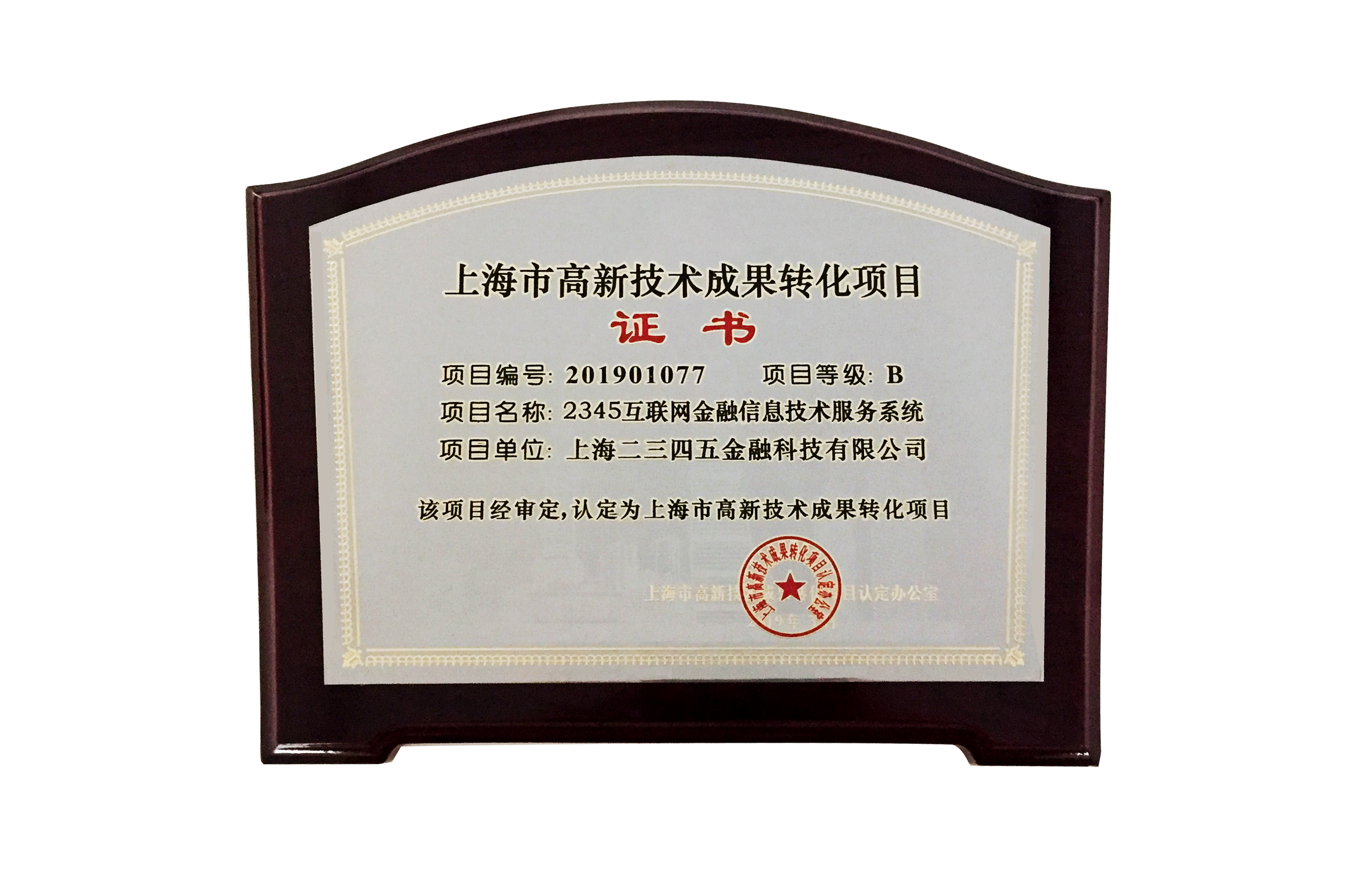 近日,上海市高新技術成果轉化項目認定辦公室公示了2019年第1批上海市高新技術成果轉化項目。繼上海二三四五網絡科技有限公司和上海二三四五移動科技有限公司已分別獲得此項認定后,上海二三四五金融科技有限公司的“2345互聯網金融信息技術服務系統”項目又一次獲得了此項認定。