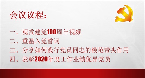 會議開始,黨員們觀看了建黨100周年視頻,跟著視頻回顧了黨建立百年以來的光輝歷程,不忘歷史,展望未來。之后,在黃國敏書記的帶領下,所有參會黨員重溫了入黨誓詞,再一次明確了自己的責任和使命,堅定了作為共產黨員的理想信念。