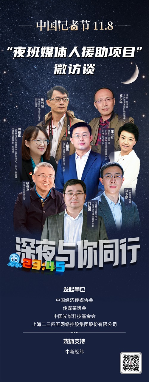 此次推出的“夜班媒體人援助項目”微訪談,是2021年度“夜班媒體人援助項目”的重要短視頻記錄形式,由中國經濟傳媒協會、《傳媒茶話會》、中國光華科技基金會,以及上海二三四五網絡控股集團股份有限公司聯合發起,由中新經緯提供媒體支持。